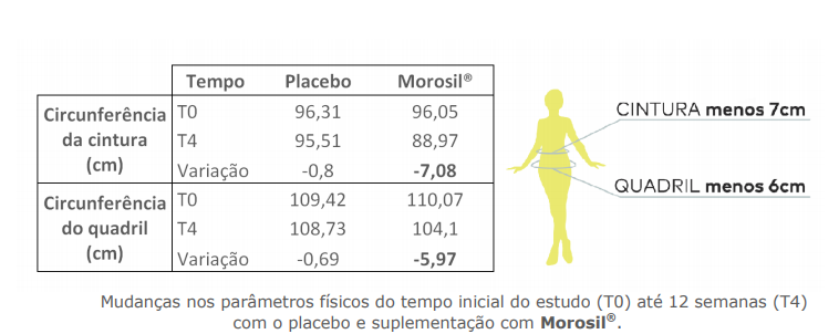 Este estudo foi realizado para avaliar o efeito da suplementação de Morosil® em voluntários saudáveis com sobrepeso durante 12 semanas em comparação com um grupo não tratado (placebo) na redução de medidas. O estudo clínico avaliou 30 voluntários com IMC entre 25 e 35 kg/m2 que se suplementaram com 400 mg ao dia de Morosil®. Foram realizadas medidas da circunferência de quadril e cintura, das quais foram avaliadas no início do tratamento (T0) e após 12 semanas (T4).